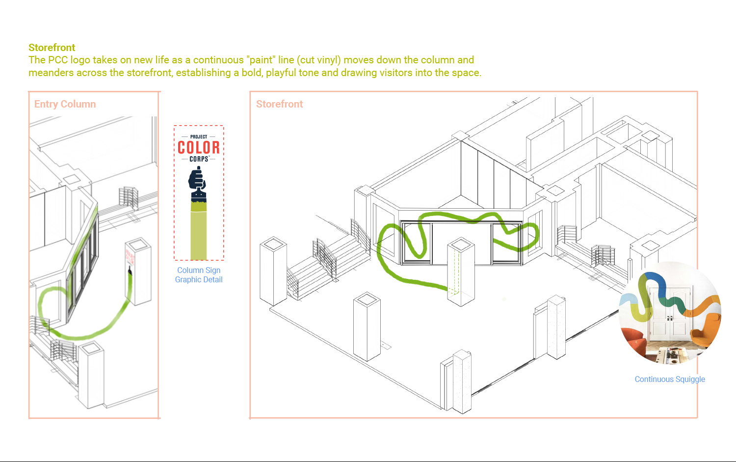 The visitor experience started with our Project Color Corps logo splashing a vibrant green ribbon framing the showroom’s glass windows and literally “painting the town” from the hallway, guiding guests into the space’s joyful expression of color.